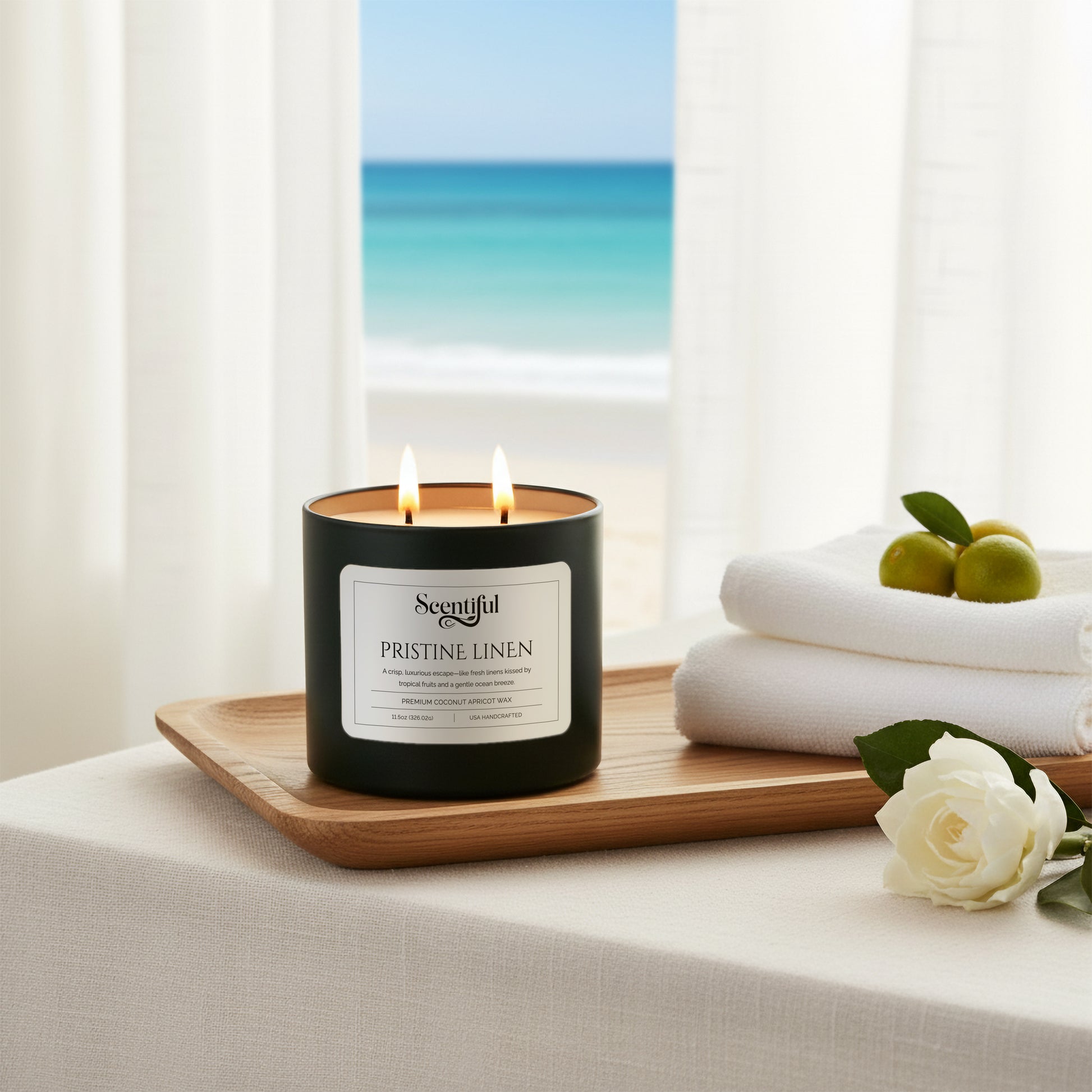 A crisp, luxurious escape — Pristine Linen captures the feeling of freshly laundered sheets billowing in a sun kissed breeze. Tropical fruits mingle with delicate orange flower and tuberose, while amber and soft musk wrap the air in quiet elegance. It’s the scent of a space renewed, ready to welcome you into its calm.
