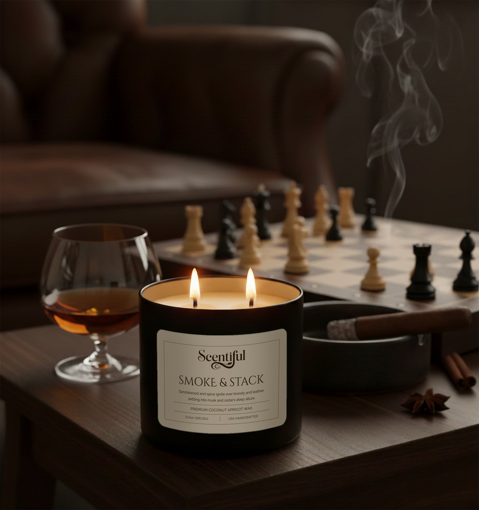 Sandalwood and spice ignite over brandy and leather, settling into musk, cedar, and vanilla. Smoke & Stack is the scent of a fireside evening — rich, layered, and steeped in quiet allure.